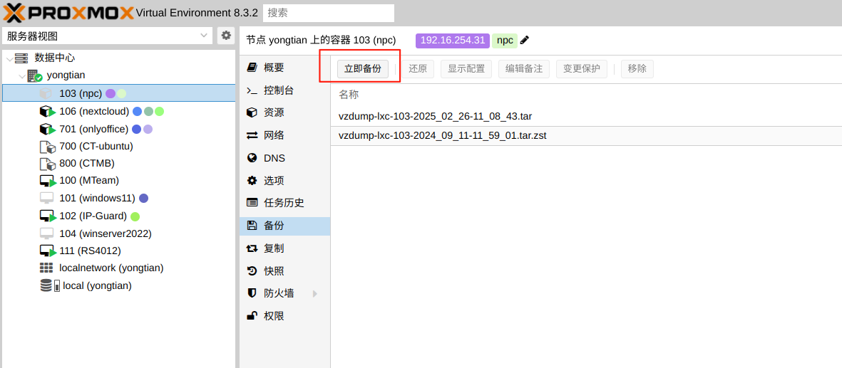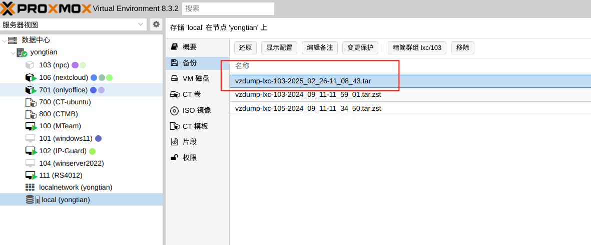 scp vzdump-lxc-103-2025_02_26-11_08_43.tar root@192.16.254.2:/var/lib/vz/dump/